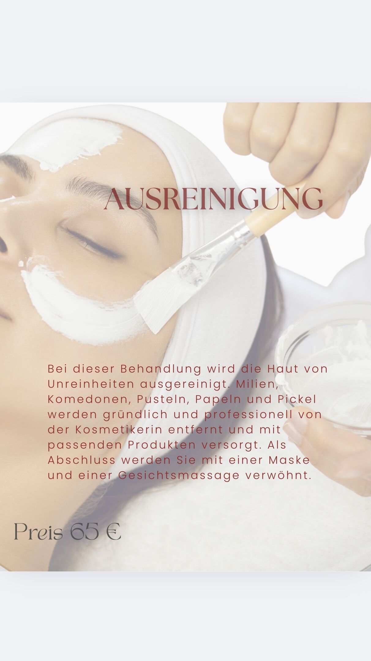 Jede kosmetische Behandlung beinhaltet eine Diagnose des aktuellen Hautzustandes; eine ausführliche Beratung für die Pflege zu Hause und die dazugehörigen Tipps für das Wohlbefinden ihrer Haut; ein dazugehöriges Peeling; eine gründliche Ausreinigung der Haut; eine passende Maske; und als Krönung eine verwöhnende Gesichtsmassage.